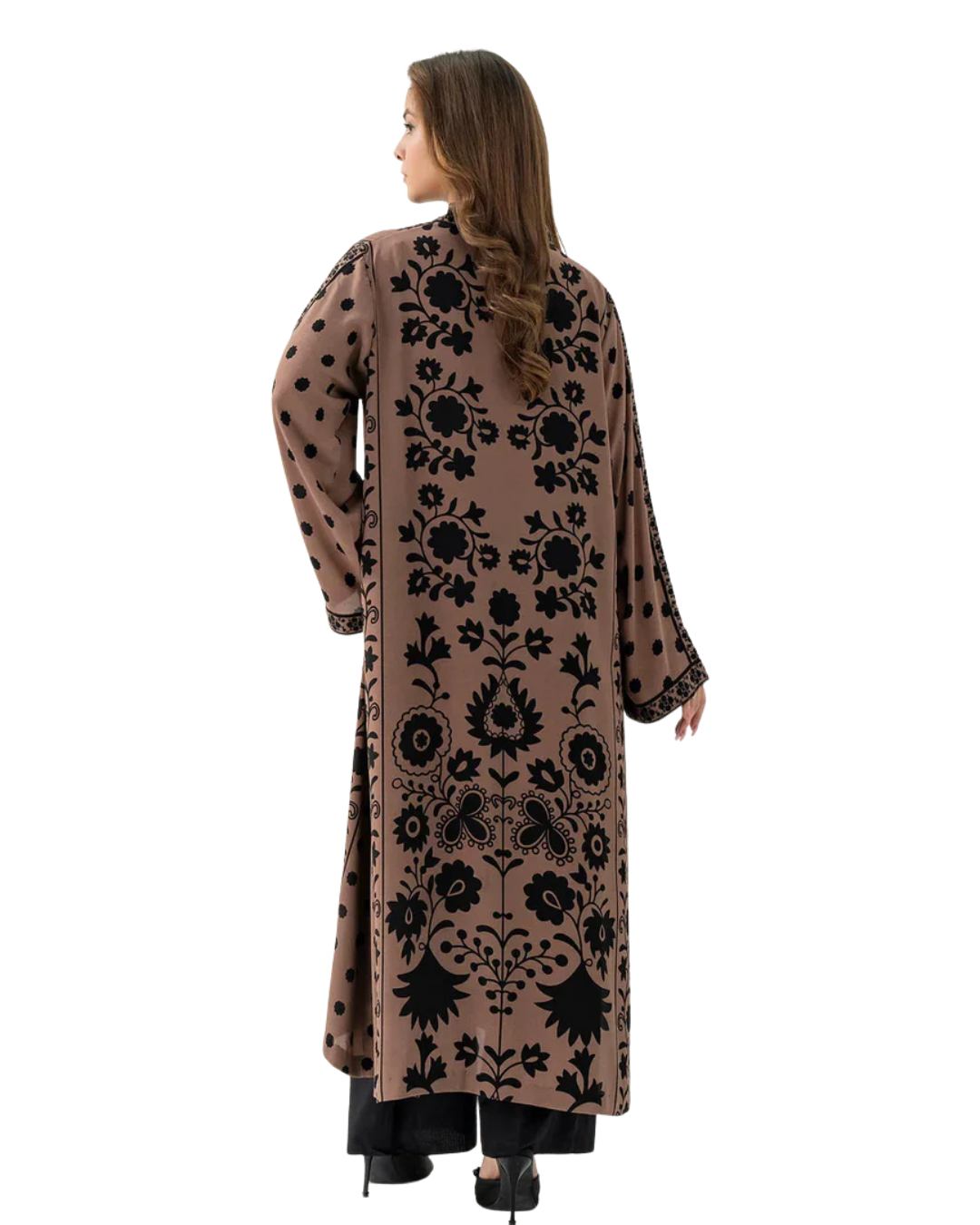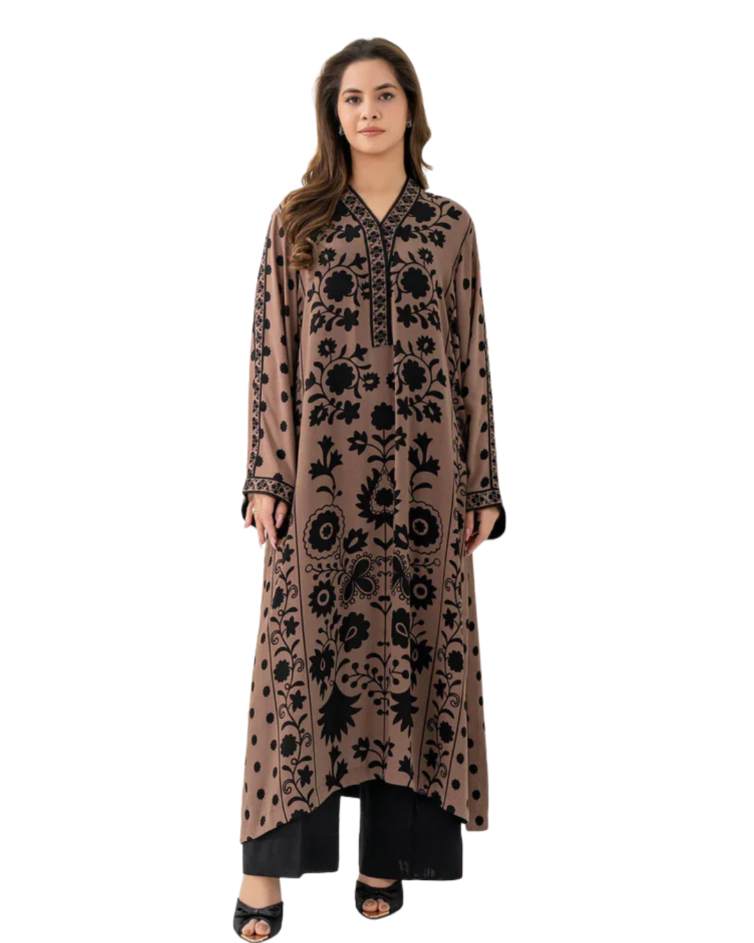 Stuff: Good Quality stitched 2 piece Lawn Design: Bold black floral motifs on a classic brown canvas for timeless elegance Set: Stitched long shirt with asymmetrical hemline + straight black trousers Size: Standard Loose Fit (Chest Size 21) Perfect For: Casual outings, office wear & graceful evening gatherings Delivery: Free Home Delivery – Open Parcel Before Payment