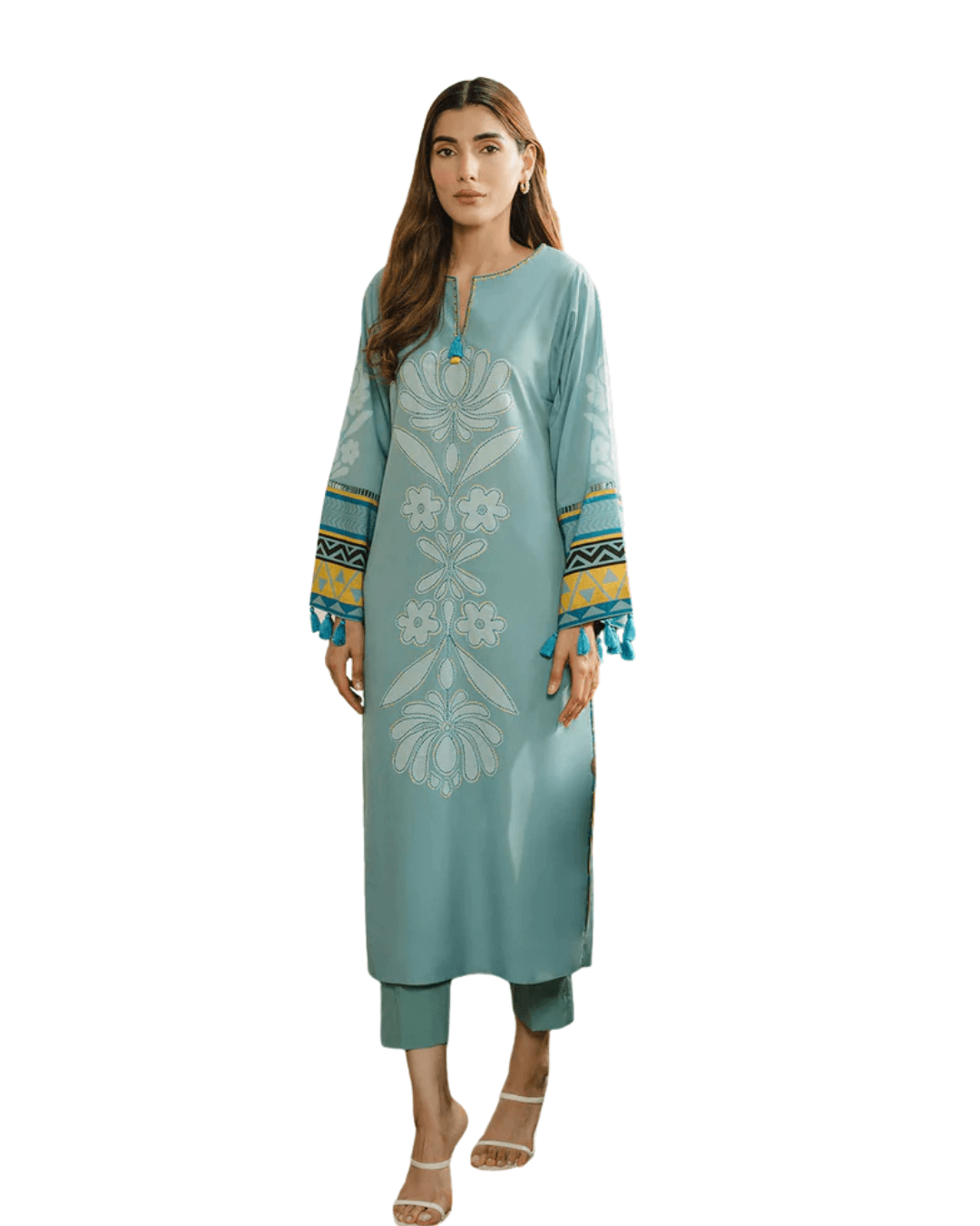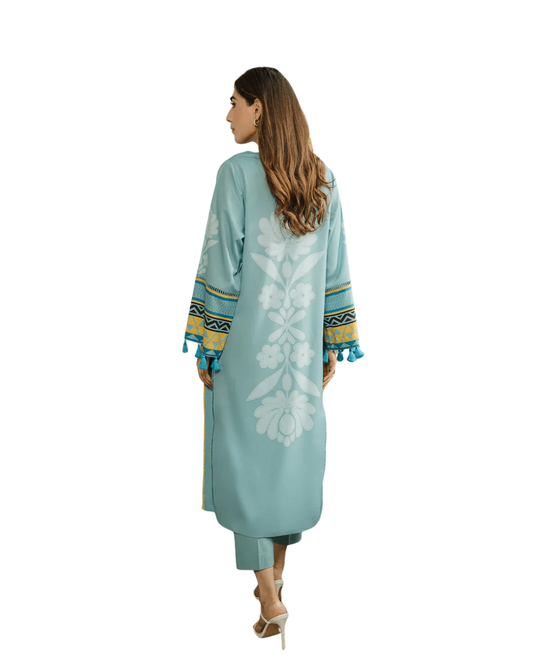 Stuff: Good Quality Stitched 2 piece Lawn Design: Pastel blue base with elegant floral front print and vibrant geometric sleeve detailing finished with tassel accents Set: Long stitched shirt with side slits + straight trousers Size: Standard Loose Fit (Chest Size 21) Perfect For: Daytime elegance, casual chic & festive wear Delivery: Free Home Delivery – Open Parcel Before Payment