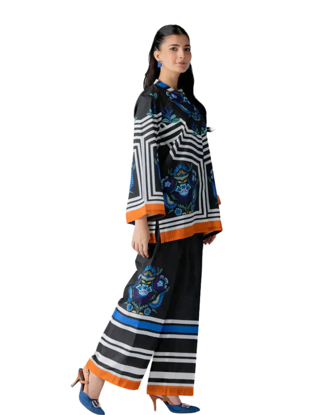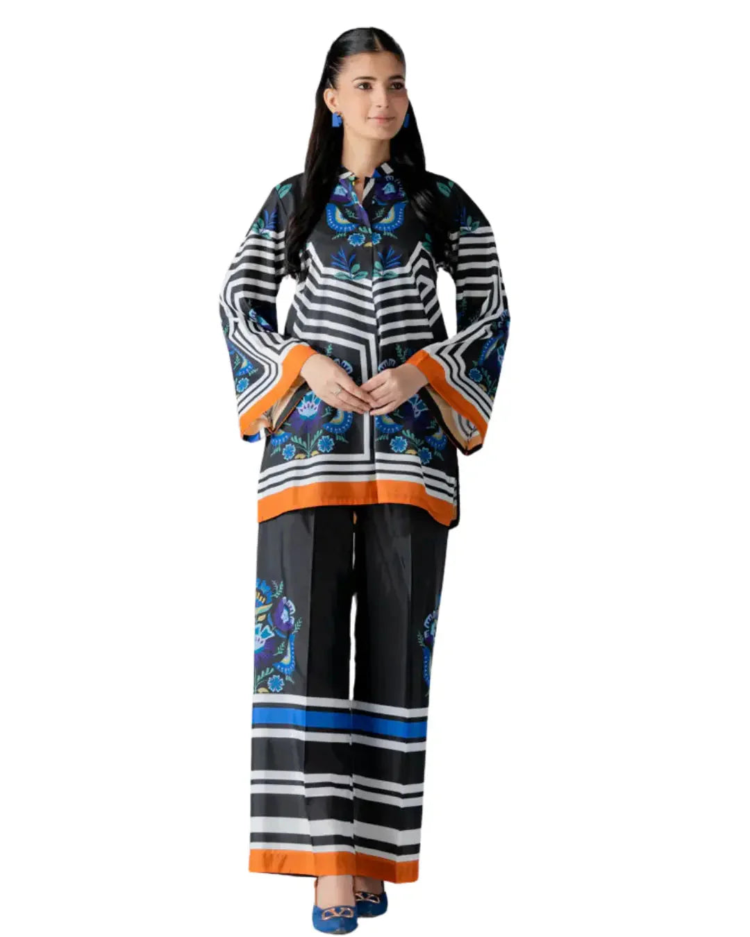 Design: Black & white stripes with blue floral patterns and bold orange borders for a standout, stylish look